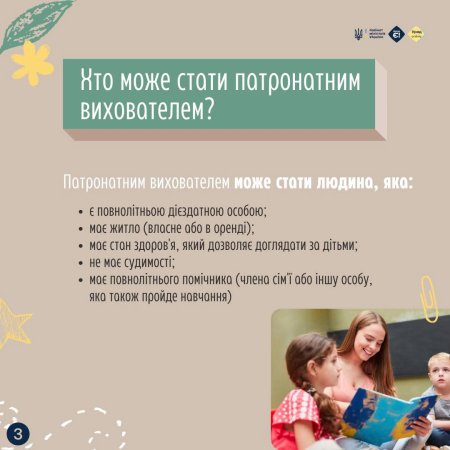 * Підтримка: Патронатні вихователі отримують соціальну та фінансову підтримку від держави.