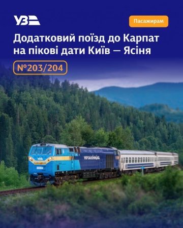 – Чудові новини для всіх, хто планує літній відпочинок у мальовничих Карпатах! Через високий попит на гірські напрямки "Укрзалізниця" призначила курсування додаткового швидкого поїзда №203/204 Київ – Ясіня.