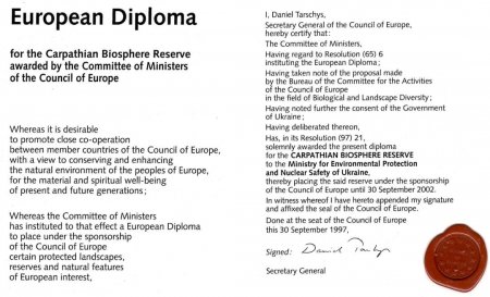 Карпатський біосферний заповідник є єдиною природоохоронною територією в Україні, яка удостоєна Європейського Диплому Ради Європи. Вперше отримавши його у 1997 році, КБЗ вже чотири рази успішно підтвердив відповідність високим міжнародним критеріям, що свідчить про unwaveringcommitment заповідника до збереження унікальних природних комплексів.