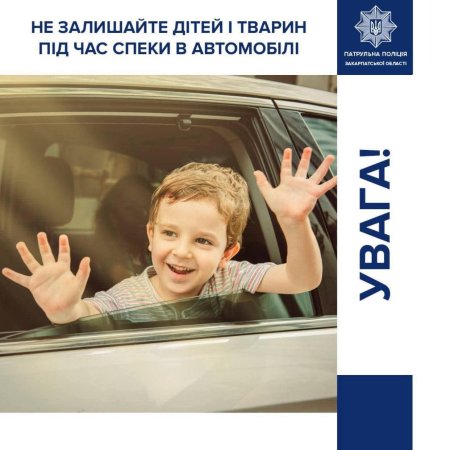 Патрульна поліція Закарпаття нагадує водіям про небезпеку літньої спеки та надає важливі рекомендації для безпечного перебування за кермом. Високі температури становлять загрозу не лише для автомобіля, а й для водіїв, пасажирів, а особливо — для дітей і тварин.