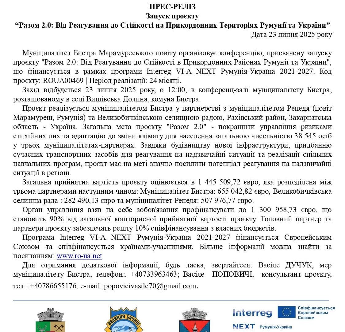 Важлива подія для Великобичківської територіальної громади! Наша громада долучається до амбітного міжнародного проєкту «Разом 2.0: Від Реагування до Стійкості на Прикордонних Територіях Румунії та України». Ця ініціатива, що реалізується за підтримки престижної програми Interreg VI-A NEXT Румунія-Україна 2021–2027, відкриває нові горизонти для нашого розвитку та безпеки.