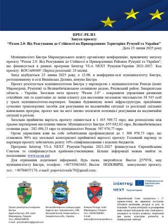 Уже 23 липня 2025 року, о 12:00, відбудеться знакова подія — перша конференція проєкту. Вона пройде у конференц-залі муніципалітету Бистра (с. Вишівська Долина, Румунія). На цій зустрічі партнери з Румунії та України представлять ключові завдання та визначать подальші кроки. Головна мета проєкту — зміцнення безпеки та підвищення стійкості прикордонних громад в умовах сучасних викликів.