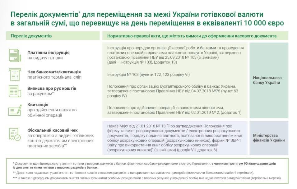 Роз’яснення Національного банку щодо переліку підтвердних документів, які є підставою для вивезення фізичними особами-резидентами готівкової валюти за межі України, за цим посиланням:
