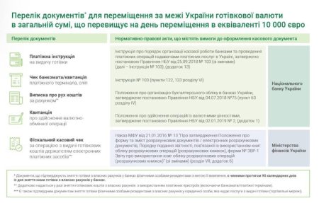 Закарпатська митниця інформує про вимоги законодавства та Перелік документів для переміщення за межі України готівкової валюти в загальній сумі, що перевищує 10 тисяч євро на одну особу.