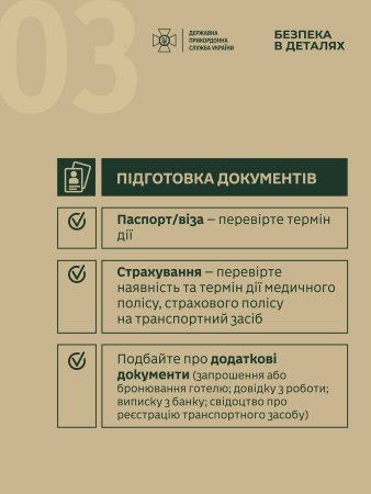 Підготовка до контролю: Тримайте всі необхідні документи (паспорти, свідоцтва, дозволи) у зручному та легкодоступному місці перед під'їздом до пункту пропуску.