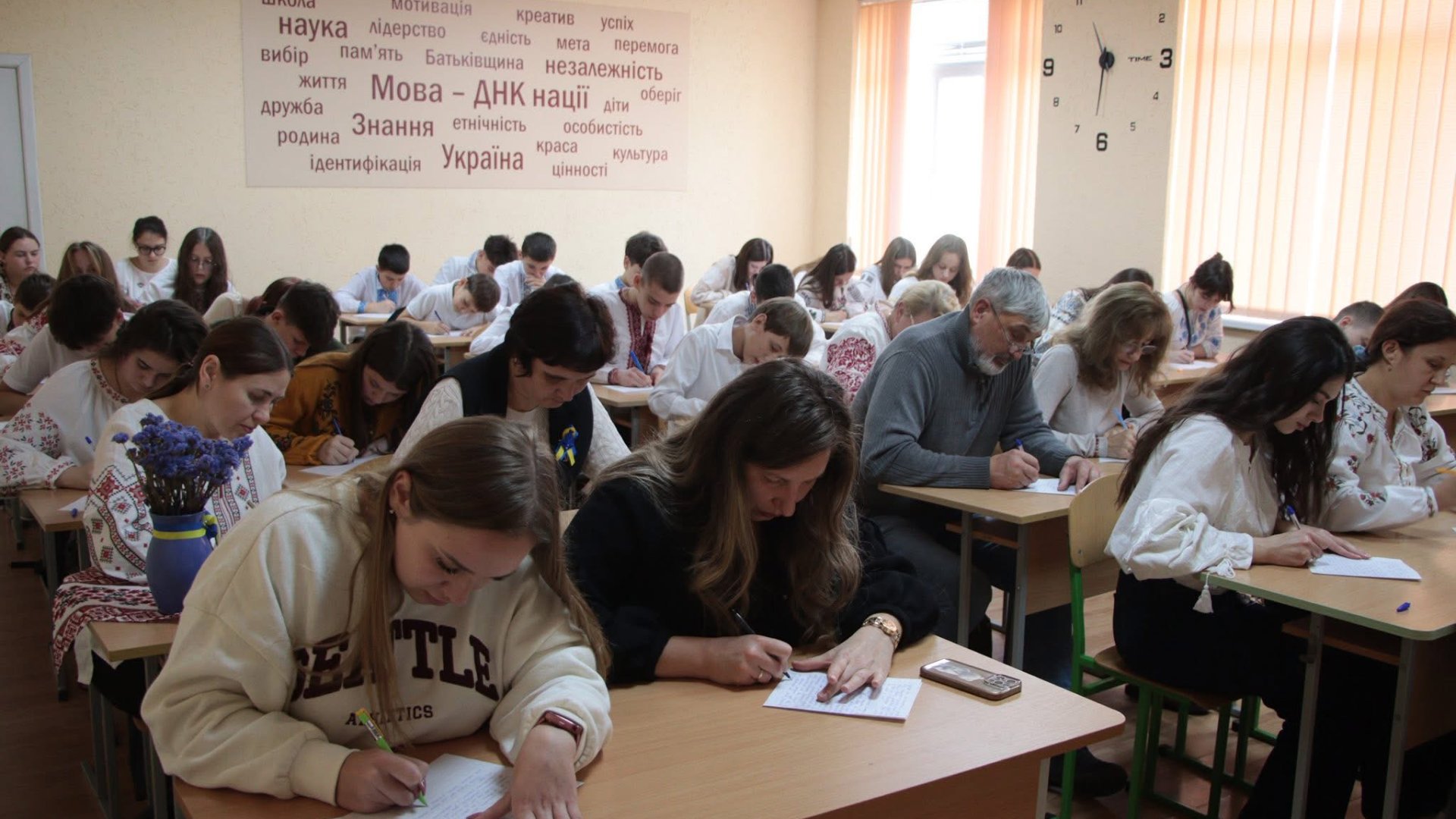 📚 Цього року до написання диктанту разом з учнями Ужгородського наукового ліцею долучився ветеран — представник ветеранського простору «ВДОМА» Олександр. Школярі та захисник пліч-о-пліч писали текст під назвою «Треба жити!» — символічне нагадування про силу єдності, вдячності й любові до рідного слова.