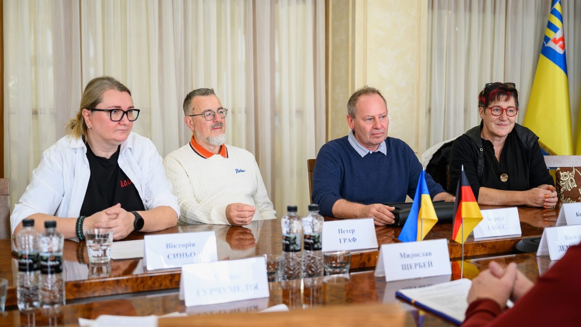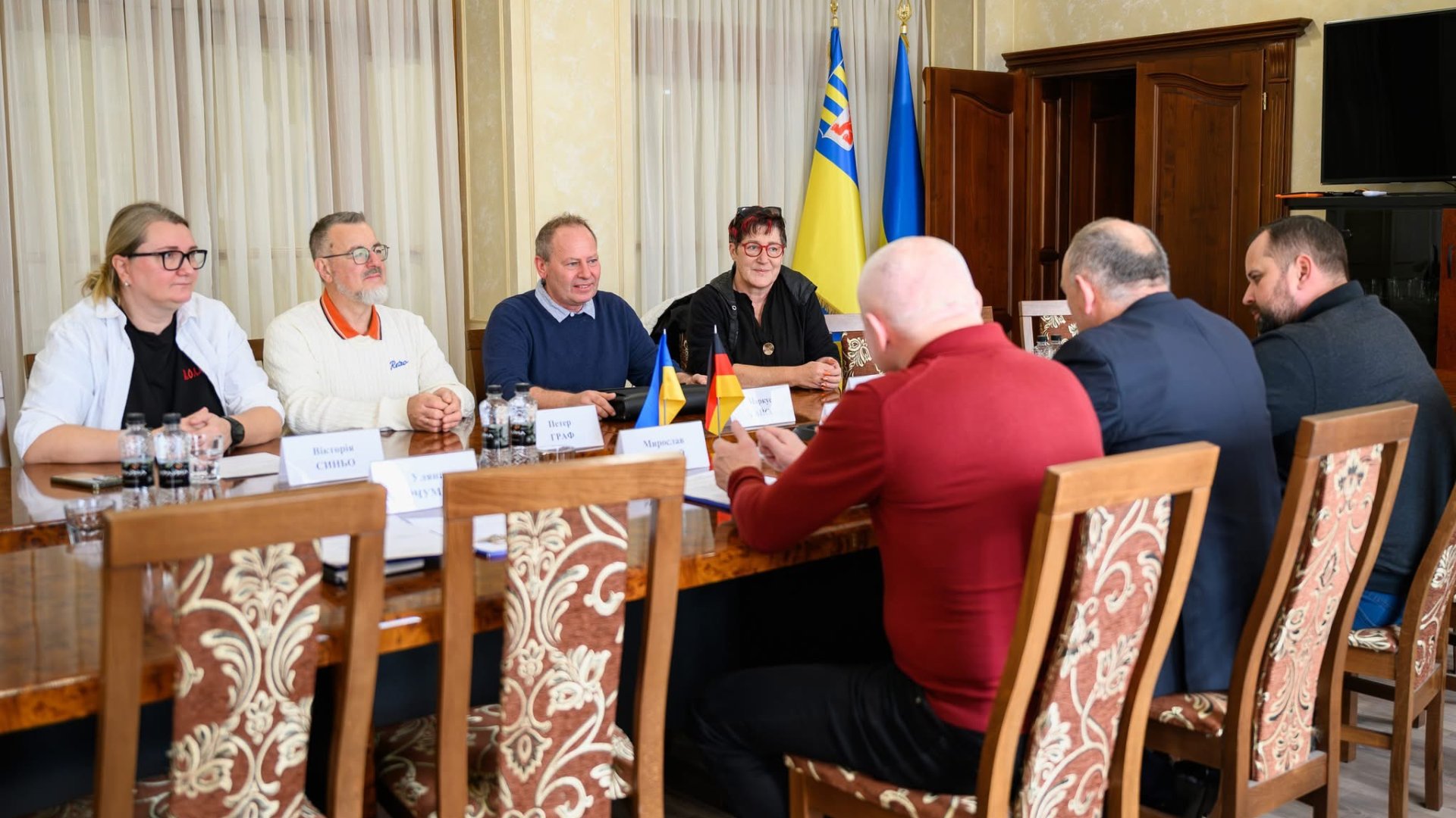 ☝️ З уповноваженим із питань партнерства муніципалітету Маркусом Гайссом, а також керівниками партнерського товариства Воловець (Україна) – Бад - Ендорф (Німеччина) Корнелією та Петером Граф зустрілися заступник голови Закарпатської обласної ради Василь Дем’янчук, керуючий справами виконавчого апарату Закарпатської обласної ради Володимир Гнатківський та начальник управління з питань організаційного забезпечення, міжнародних та регіональних зв’язків виконавчого апарату Закарпатської обласної ради Уляна Гурчумелія та обласний депутат Мирослав Щербей.