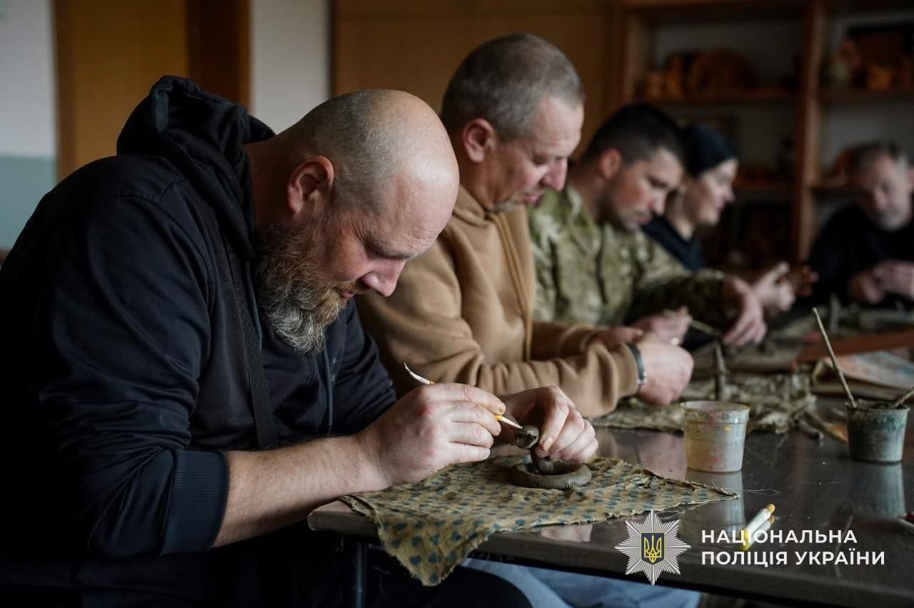 Службовці підрозділів системи МВС, що проходять лікування після поранень у закарпатській лікарні, відвідали Закарпатський обласний центр дитячої та юнацької творчості «ПАДІЮН», де спробували один із методів арттерапії — глинотерапію. Практика допомагає знизити стрес, відновити внутрішню рівновагу та виразити емоції через творчість.