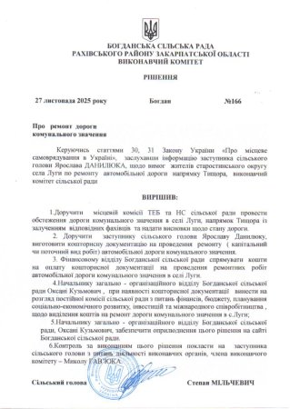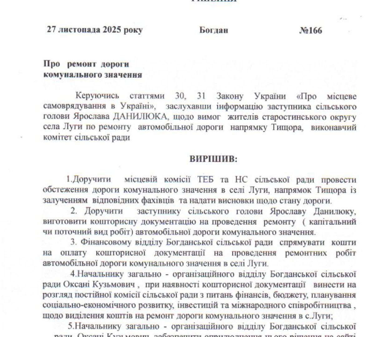 Проблема руйнування дороги комунального значення в селі Луги (урочище Тищора) була негайно розглянута на засіданні виконавчого комітету Богданської сільської ради, яке відбулося також 27 листопада.