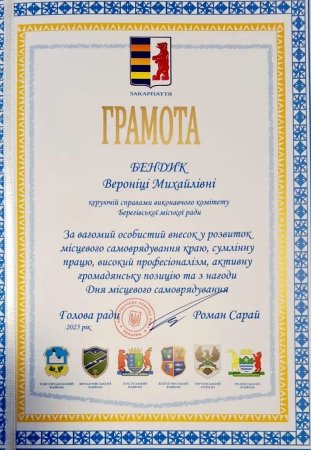 Грамотами Закарпатської обласної ради за вагомий внесок у розвиток місцевого самоврядування, сумлінну працю та професіоналізм нагороджено: