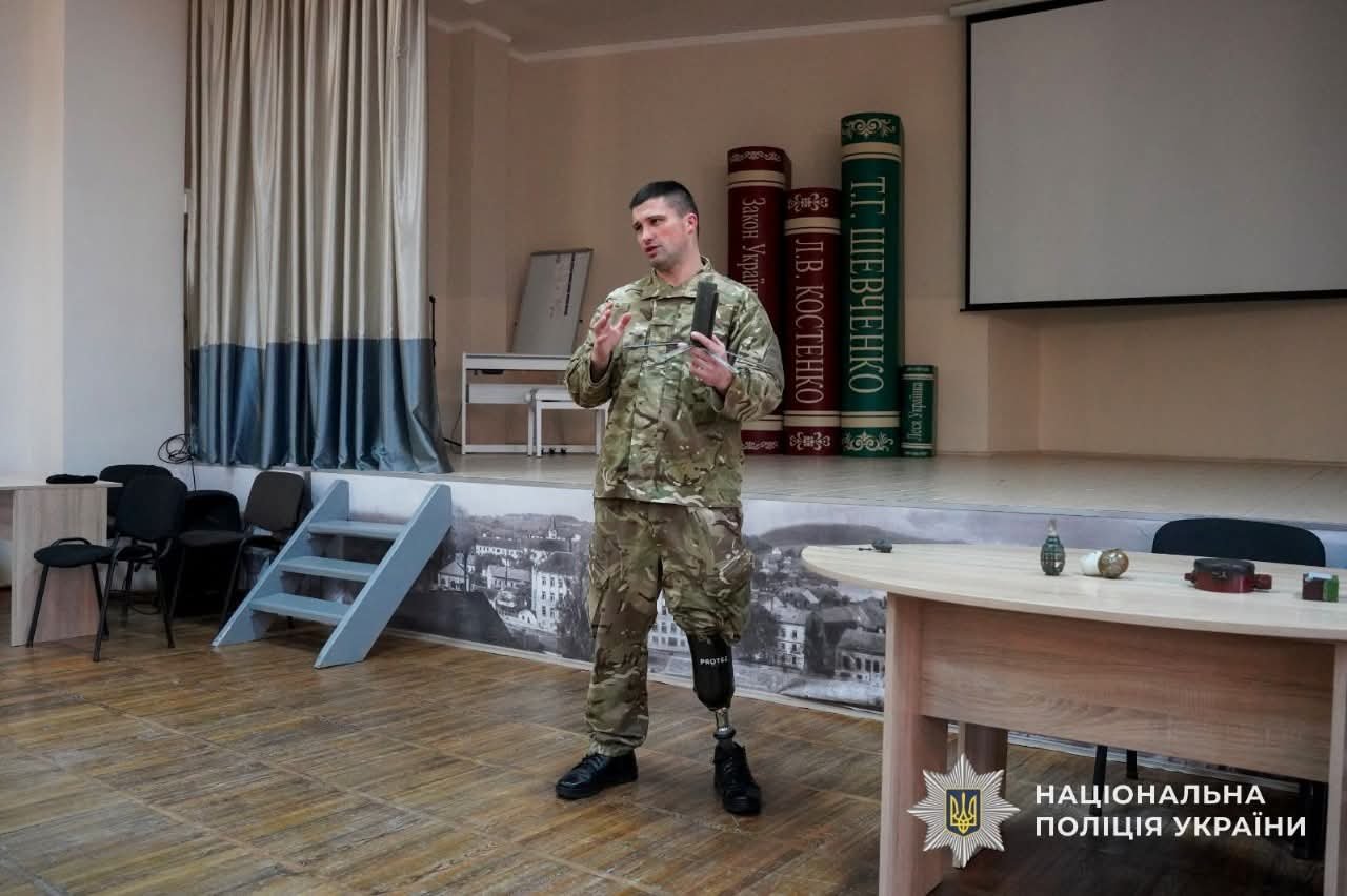 Ключовим спікером зустрічі став Владислав Горнодь, помічник начальника ГУНП в Закарпатській області з питань ветеранської політики. Пан Владислав, який є колишнім співробітником вибухотехнічної служби, прийшов до підлітків не лише з теоретичними знаннями, а й із власним, трагічним, але безцінним досвідом.