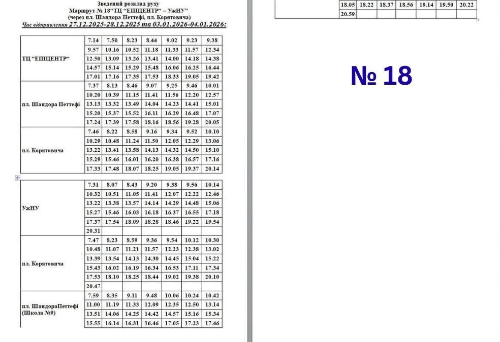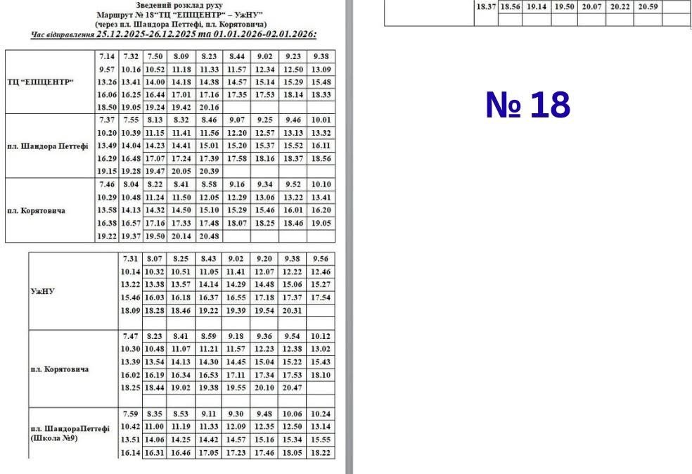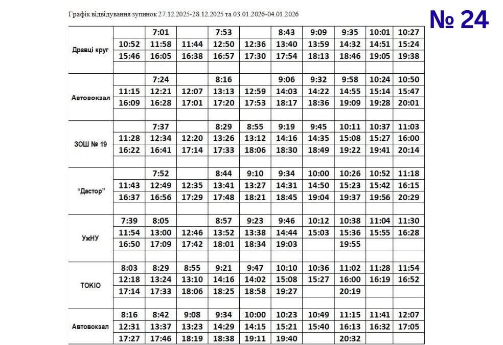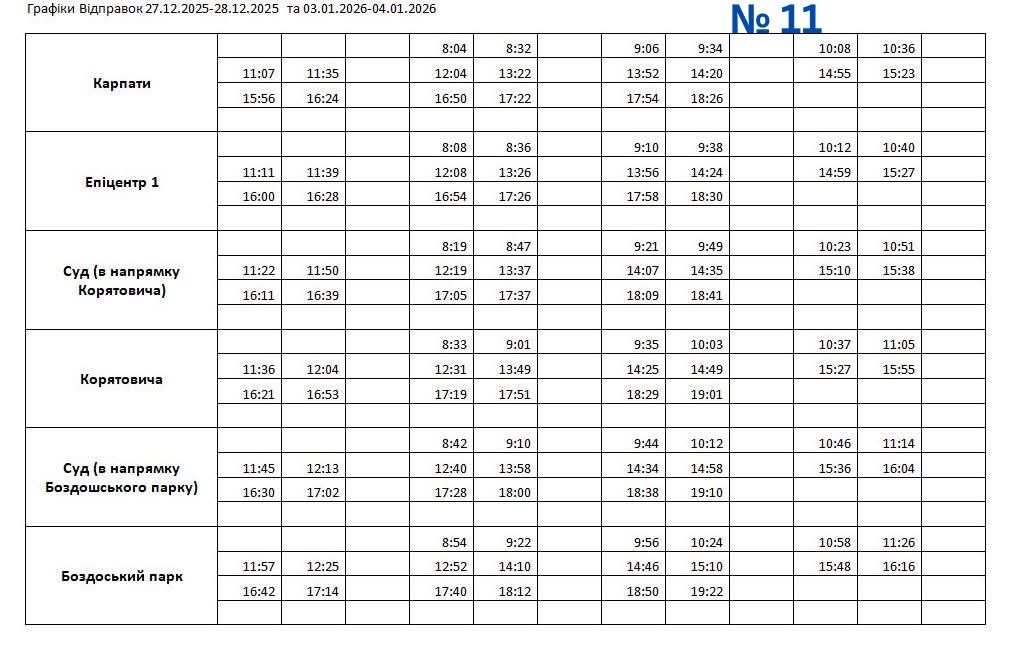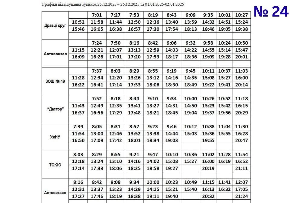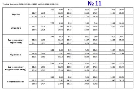 Комунальне підприємство «Ужгородський муніципальний транспорт» оприлюднило актуальні графіки руху автобусів на період різдвяно-новорічних свят.