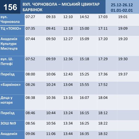 Йдеться про маршрути №9, №11, №18, №20, №22, №24 та №156, які курсуватимуть за оновленими святковими розкладами.