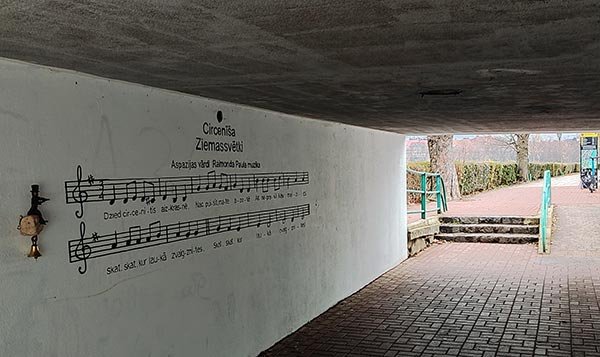 Композиція зображає цвіркуна у циліндрі, який грає на скрипці та сидить на камені з дзвіночком під ним. Праворуч розміщено нотний ряд пісні «Circenīša Ziemassvētki» (Circenītis) — латвійської різдвяної композиції, написаної у 1900 році поетесою Аспазією (Aspazija; Йоханна Емілія Лізете Розенберга), а згодом популяризованої композитором Раймондом Паулсом у 1980 році.