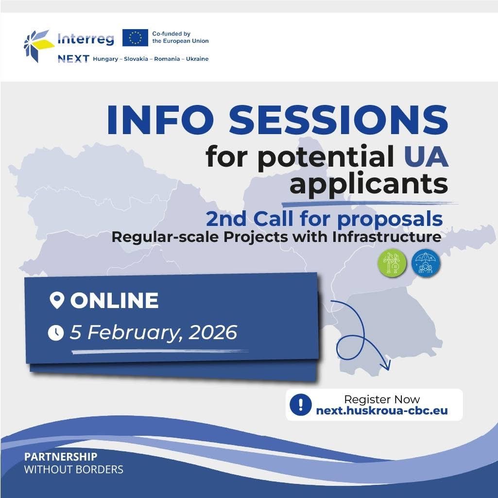 Interreg Закарпаття відкриває нові можливості для залучення європейського фінансування. У межах другого конкурсу проєктних пропозицій програми Interreg VI-A NEXT Угорщина – Словаччина – Румунія – Україна відбудеться інформаційний день для потенційних заявників з області.