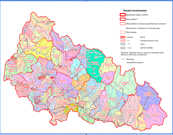 Адміністративна карта Закарпатська область за останні роки суттєво змінилася. Якщо раніше в області було 13 районів, то після реформи децентралізації їхню кількість скоротили до шести, а основну роль в управлінні територіями перебрали на себе територіальні громади.