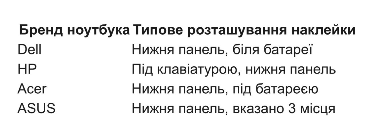 Першим місцем, яке варто перевірити, є наклейки на корпусі ноутбука. На невеликій панелі знизу зазвичай розміщується етикетка, що містить не лише модель пристрою, але й серійний номер, характеристики процесора та іншу важливу інформацію. Просто переверніть ноутбук і уважно огляньте його нижню частину.