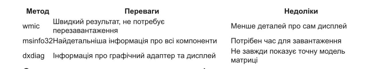 Операційна система Windows має вбудовані інструменти, які дають можливість точно визначити модель дисплея без необхідності розбирати ноутбук. Я регулярно використовую ці способи перед тим, як замовити заміну екрана ноутбука.
