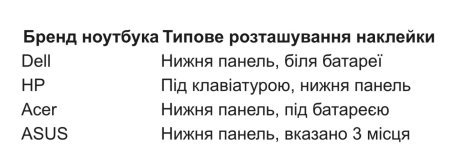 Якщо наклейки на корпусі стерлися або їх немає, рекомендується перевірити відсік для батареї. Перед тим як шукати інформацію там, вимкніть ноутбук через меню "Пуск" і витягніть зарядний пристрій.