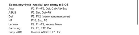 Для входу в BIOS необхідно натиснути певну клавішу або комбінацію клавіш відразу ж після запуску ноутбука. Ці кнопки можуть змінюватись в залежності від виробника: