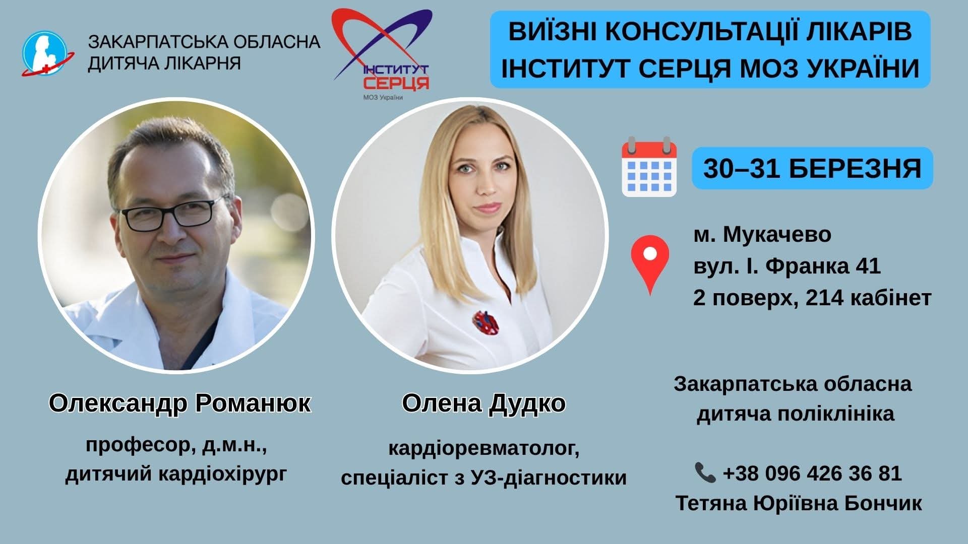 Унікальна можливість для мешканців Закарпаття: 30–31 березня в Мукачеві відбудеться виїзний прийом провідних спеціалістів київського Інституту серця МОЗ України. Маленькі пацієнти з серцево-судинними захворюваннями зможуть отримати висококваліфіковану допомогу, не виїжджаючи за межі області.