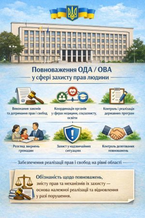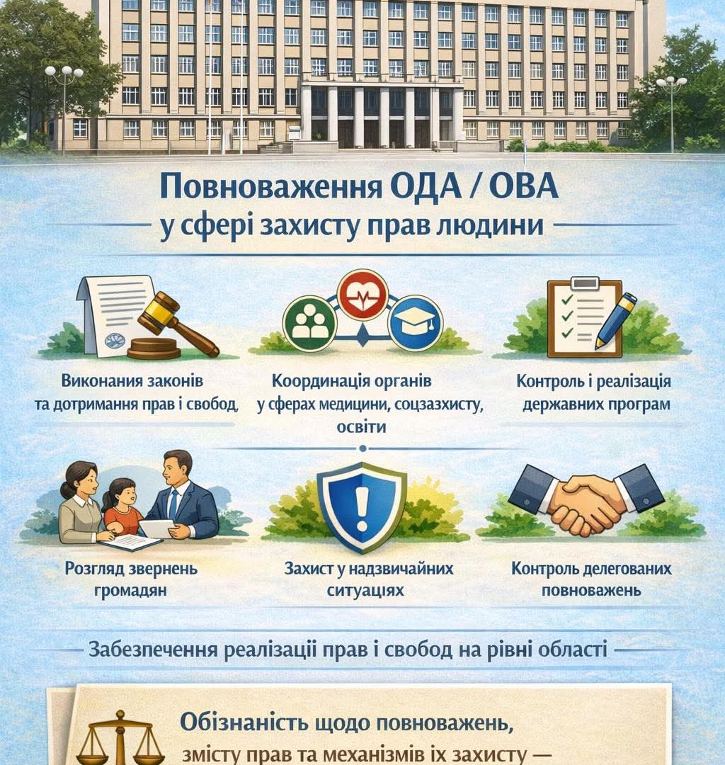 У реаліях сьогодення роль обласних військових адміністрацій (ОВА) стала ключовою у забезпеченні життєдіяльності регіону. Проте не всі громадяни знають, що саме ОВА є головним гарантом дотримання їхніх прав та свобод на місцевому рівні. Розповідаємо, які саме питання належать до компетенції адміністрації та як отримати допомогу.