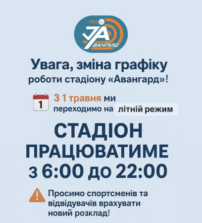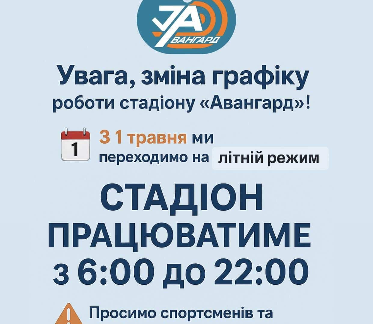 Раді повідомити мешканців та гостей Ужгорода про оновлений графік роботи стадіону "Авангард"! З 1 травня улюблений спортивний об'єкт переходить на літній режим, щоб ви мали ще більше часу для занять спортом та активного відпочинку.