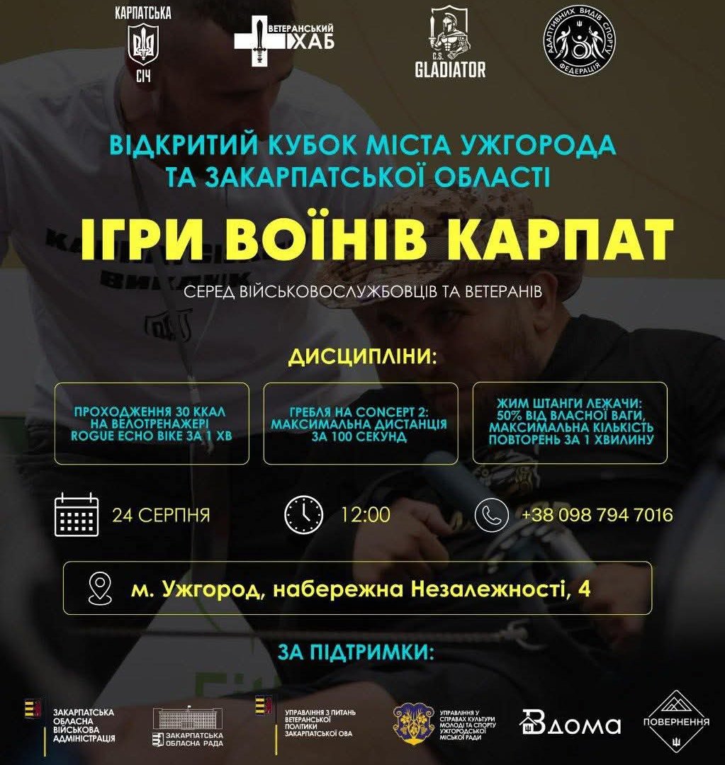 24 серпня в Ужгороді відбудеться важлива спортивна подія — Відкритий кубок міста та Закарпатської області з функціональних та силових видів спорту. Змагання, відомі як «Ігри Воїнів Карпат», зберуть разом ветеранів, військовослужбовців та людей з інвалідністю, які отримали поранення внаслідок війни, щоб випробувати свою силу та витривалість.