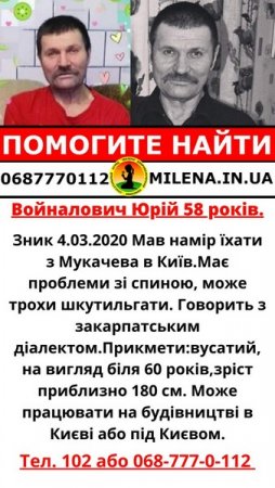 Уже більше півроку рідні розшукують Войналович Юрія Володимировича, 1962 року народження. Чоловік мав намір їхати з Мукачева в Київ на заробітки. Останнє відоме місцезнаходження — центр Мукачева, є інформація від водія маршрутки, якою доїхав до вокзалу. Але чи сів на потяг, чи ні — досі не відомо. При собі телефону не мав. Як і документів, які чоловік забув вдома. До цього року проблем з пам’яттю не було, але хто знає, що могло статись, зазначають рідні. Чолвік має проблеми зі спиною, може трохи шкутильгати. Говорить з закарпатським діалектом. Вусатий, на вигляд біля 60 років. Ріст приблизно 180 см. Може працювати на будівництві в Києві або під Києвом.
