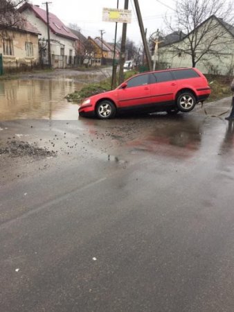 Водій червоного “Фольцвагена”не побачив яму, що приховувалась під водою, та в’їхав у неї. Внаслідок чого автіку опинилася у справжній пастці.
