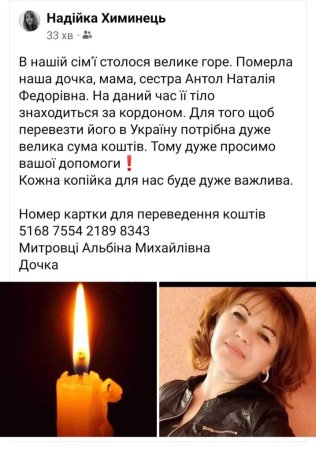 ”В нашій сім’ї сталося велике горе. Померла наша дочка, мама, сестра Антол Наталія Федорівна. На даний час її тіло знаходиться за кордоном. Для того, щоб перевезти його в Україну, потрібна дуже велика сума коштів. Тому дуже просимо вашої допомоги. Номер картки для переведення коштів: 5168 7554 2189 8343 Митровці Альбіна Михайлівна (дочка)”, – йдеться в повідомленні.