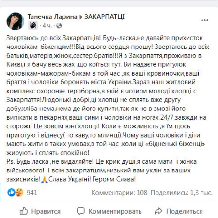 “Звертаюсь до всіх Закарпатців! Будь-ласка, не давайте прихисток чоловікам-біженцям!!! Від всього сердця прошу! Звертаюсь до всіх батьків, матерів, жінок, сестер, братів!!! Я з Закарпаття, проживаю в Києві, і я бачу весь жах, що коїться тут. Ви надаєте притулок чоловікам-мажорам-бикам в той час, як ваші кровиночки, ваші браття і чоловіки боронять міста України. Зараз наш житловий комплекс охороняє тероборна, в якій є чотири молоді хлопці с Закарпаття! Людонькі добрі, ці хлопці не сплять вже другу добу, хліба нема ,нема де його купити, так як не в змозі його випікати в пекарнях, ваші сини і чоловіки на ногах 24/7, завжди на сторожі! Це зовсім юні хлопці! Коли є можливість, я їм щось приготую і віднесу (то каву, то млинці). Чому ваші чоловіки і діти мають жити в таких умовах, в той час, коли ці «бідненькі біженці» жирують і сплять спокійно!