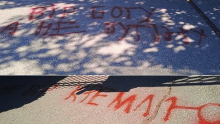 На паркані собору зробили написи “ФСБ”, “ZОМБІ” та “Z”. Навколо території собору на асфальті написали “Не вірте путіну”, “Вір Богу, а не путіну” та “Не вір кремлю”.