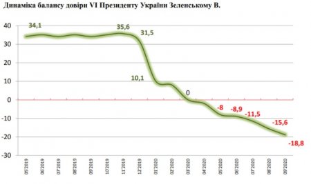 Так, в ході дослідження, проведеного з 20 по 29 вересня методом індивідуального інтерв’ю серед 3014 респондентів з усієї України, крім окупованої території Донбасу і Криму, баланс довіри до президента Володимира Зеленського склав -18,8%.