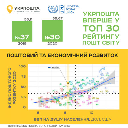 Україна завдяки роботі Укрпошти посіла 30 місце в рейтингу Всесвітнього поштового союзу (ВПС) за індексом поштового розвитку (2IPD). Національний поштовий оператор покращив свої позиції в порівнянні із минулорічним рейтингом на 7 позицій. Загалом до переліку ввійшло 170 пошт світу з 192 існуючих, 22 оператори не заміряли із-за низького рівня їх розвитку. Україна обійшла Норвегію, Катар, Казахстан, які вкладають значні державні інвестиції в розвиток своїх національних пошт. При цьому в групі країн з ідентичним ВВП на душу населення Укрпошта показала найкращий результат.