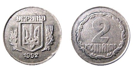 На реверсі зазначений номінал «2 копійкі», на аверсі – напис «Україна», малий герб і дата «1992». Як вийшло, що у монети обідок значно віддалений від краю. Згадує Н. Мітіна, гравер ЛВЗ: діаметри 2 коп. і 10 коп. відрізнялися незначно, і здавалося, що вони однакові, тому інструмент на 2 копійки був виконаний як і на 10 копійок, а коли з’ясувалося, що 2 коп. діаметром більше, був проточен буртик за розміром цієї монети. Так і вийшло, що у першій українській копійці віночок віддалений від бурту, пізніше цю помилку виправили.