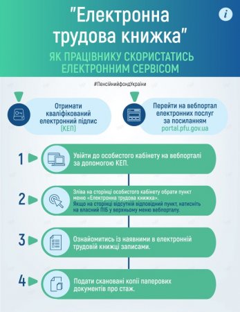 Сервіс дозволяє подавати через вебпортал електронних послуг Фонду (portal.pfu.gov.ua) підписані кваліфікованим електронним підписом скановані копії паперових трудових книжок, інших документів, які підтверджують трудову діяльність працівника.