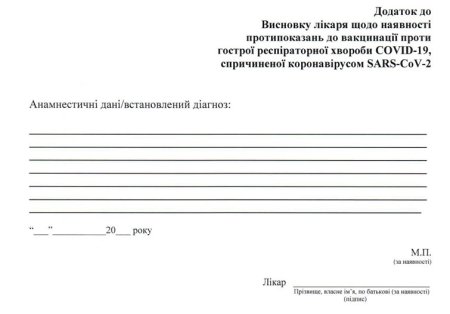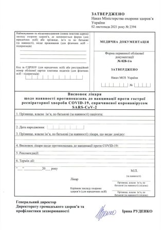 Відповідну форму № 028-1/о та інструкцію щодо її заповнення затверджено наказом МОЗ № 2394 від 2 листопада 2021 року. У довідці про тимчасові протипоказання до вакцинації проти COVID-19 має бути обов’язково вказаний термін дії цих протипоказань.