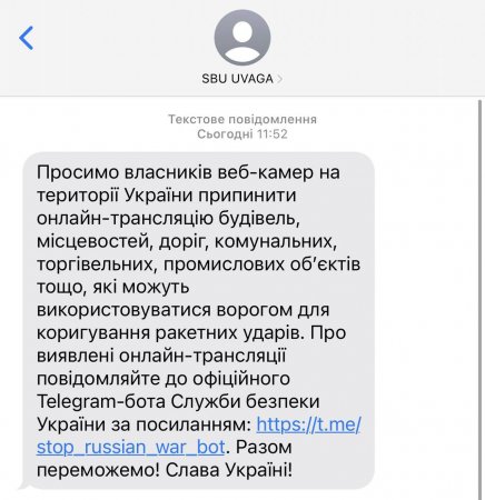 Служба безпеки України масово розсилає українцям смс-повідомлення із закликом припинити онлайн-трансляції власників камер спостереження.