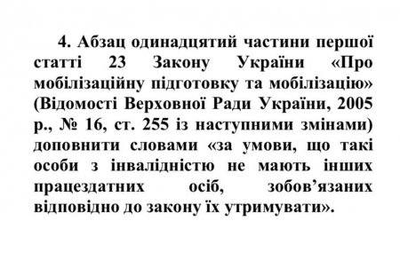 До цього часу в законі було сказано, що від мобілізації звільняються особи, які мають дружину (чоловіка), батьків або батьків дружини (чоловіка) з інвалідністю 1 або 2 групи.