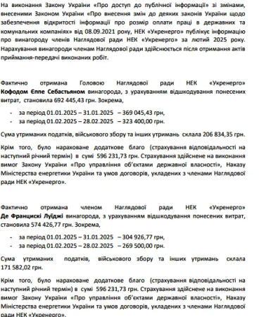 НЕК "Укренерго" оприлюднила інформацію про винагороду членів Наглядової ради за лютий 2025 року, згідно з Законом України "Про доступ до публічної інформації".