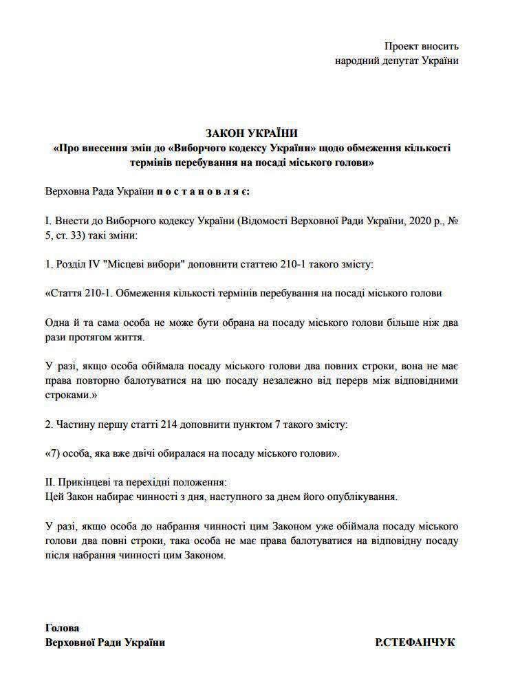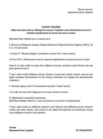 Згідно з текстом документу, який циркулює онлайн, пропонується встановити, що одна й та сама особа не може бути обрана на посаду міського голови більше ніж два рази протягом життя.