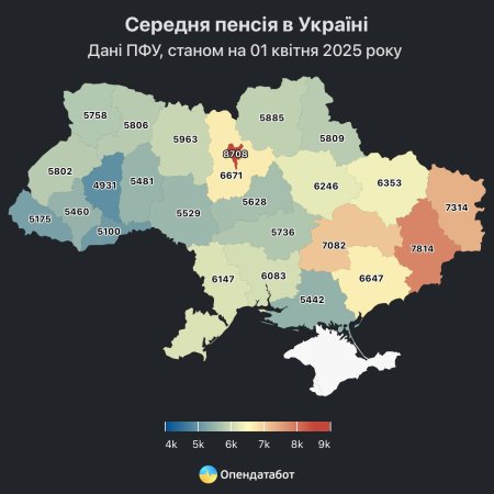 Як видно з карти, найвищий середній розмір пенсії зафіксовано у місті Київ – 8708 грн. Це на 37% вище за середній показник по Україні, який становить 6341 грн (близько 152 доларів США за поточним курсом). До регіонів з відносно високими пенсіями також належать Рівненська (7276 грн) та Донецька (7158 грн) області.