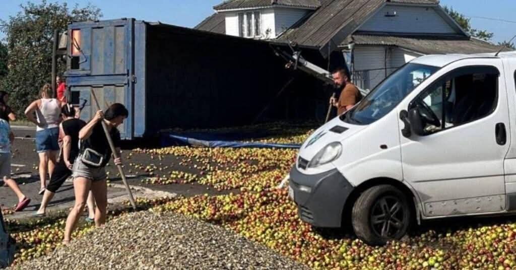 Сьогодні у прикарпатському селищі Заболотів зіткнулися легковий та вантажний автомобілі. Фура з яблуками перекинулася на бік.
