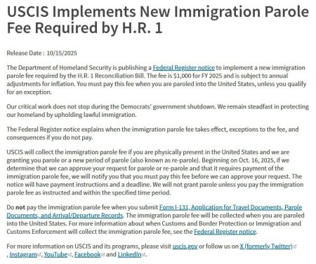 Імміграційна служба США (USCIS) оголосила про впровадження нового збору в розмірі $1 000 за надання так званого імміграційного пароля (parole) — спеціального дозволу на тимчасовий в’їзд до Сполучених Штатів. Це рішення ухвалене відповідно до Закону про узгодження H.R. 1 (H.R. 1 Reconciliation Bill) та набирає чинності з 16 жовтня 2025 року.