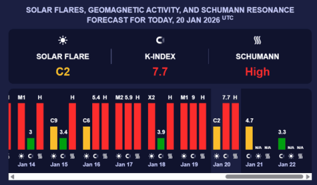 У вівторок, 20 січня, геомагнітна активність Сонця досягла критичних позначок. За даними meteoagent та Британської геологічної служби, планету накрила магнітна буря червоного рівня, потужність якої оцінюють у 7.7 бала за 9-бальною шкалою (К-індекс).