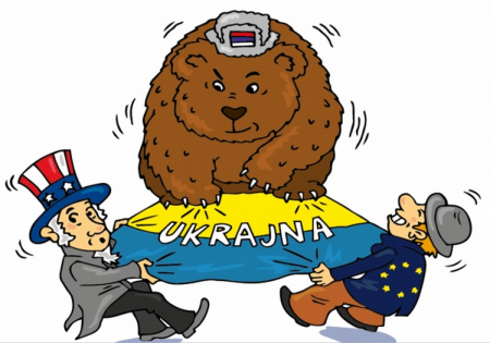 “У багатонаціональній Україні розподіл по території національностей дуже нерівномірний. Більшість – це українці за національністю, але на сході країни значна частка росіян, а на Кримському півострові вони становлять більшість. Дві східнослов’янські мови (російська, українська) дуже подібні, а п’ята частина населення розмовляє змішаною російсько-українською мовою. Попри це, дві етнічні групи часто ворогують одна з одною. Їхнє протистояння також спровокувало збройний конфлікт за Кримський півострів, дивіться малюнок“, — цитують текст підручника у виданні.