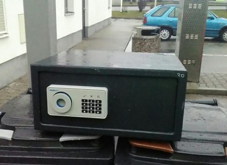 Як повідомили в поліції, сейф з електронним кодовим замком був у сміттєвому баку в Празі 5. Співробітник заправки, який знайшов його, викликав поліцію.