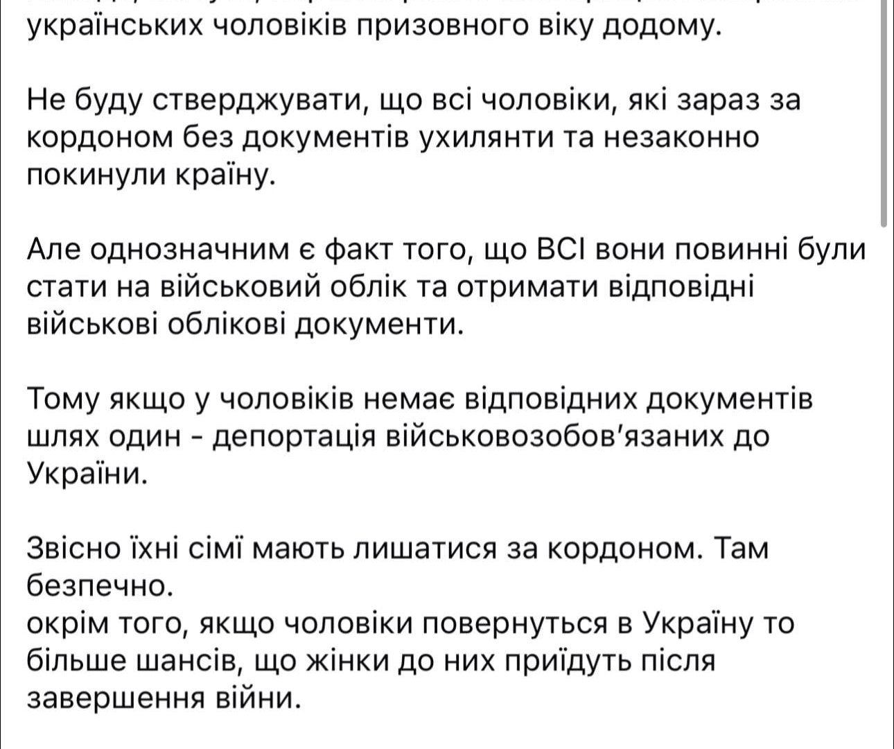 За його словами, всі чоловіки, які перебувають за кордоном, повинні були стати на військовий облік та отримати відповідні документи. Відсутність таких документів може стати підставою для депортації військовозобов’язаних до України.