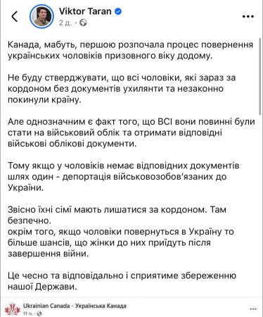 Канада, ймовірно, стане першою країною, яка почне процес повернення українських чоловіків призовного віку на Батьківщину. Про це заявив політолог та громадський діяч Віктор Таран.